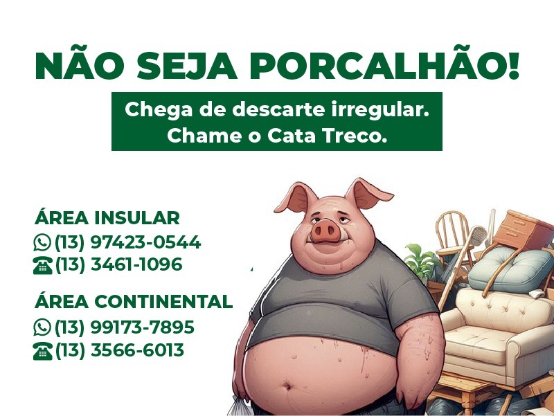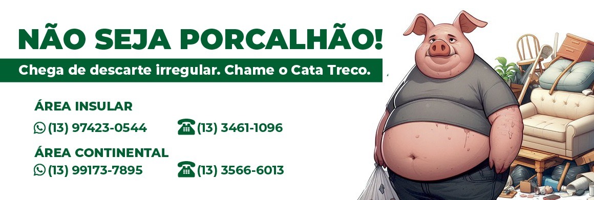 URL https://www.saovicente.sp.gov.br/cata-treco Imagem Desktop Informe uma imagem para ser visualizada no desktop. Recomendado utilização uma imagem na proporcão de 3:1. Ex 1280x590px. Descrição para Desktop Caso preenchido, este valor será visualizado na versão desktop do Carrossel. Imagem Tablet Informe uma imagem para ser visualizada no Tablet. Recomendado utilização uma imagem na proporcão de 16:9. Ex 1280x720px Sem imagem Utilizar Título e Descrição do Desktop para Tablet não Título para Tablet Caso preenchido, este valor será visualizado na versão tablet do Carrossel. Descrição para Tablet Caso preenchido, este valor será visualizado na versão tablet do Carrossel. Imagem Celular Informe uma imagem para ser visualizada no celular. Recomendado utilização uma imagem na proporcão de 4:3. Ex 800x600px. Utilizar Título e Descrição do Desktop para Celular não Título para Celular Caso preenchido, este valor será visualizado na versão celular do Carrossel. Descrição para Celular Caso preenchido, este valor será visualizado na versão celular do Carrossel. Configurações Nome curto Esse nome será exibido na URL. banner-nao-seja-porcalhao